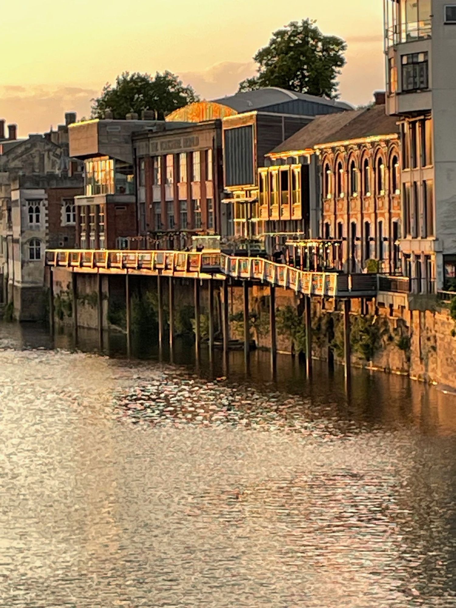 Some of those same buildings from Mickelgate Bridge later in the evening