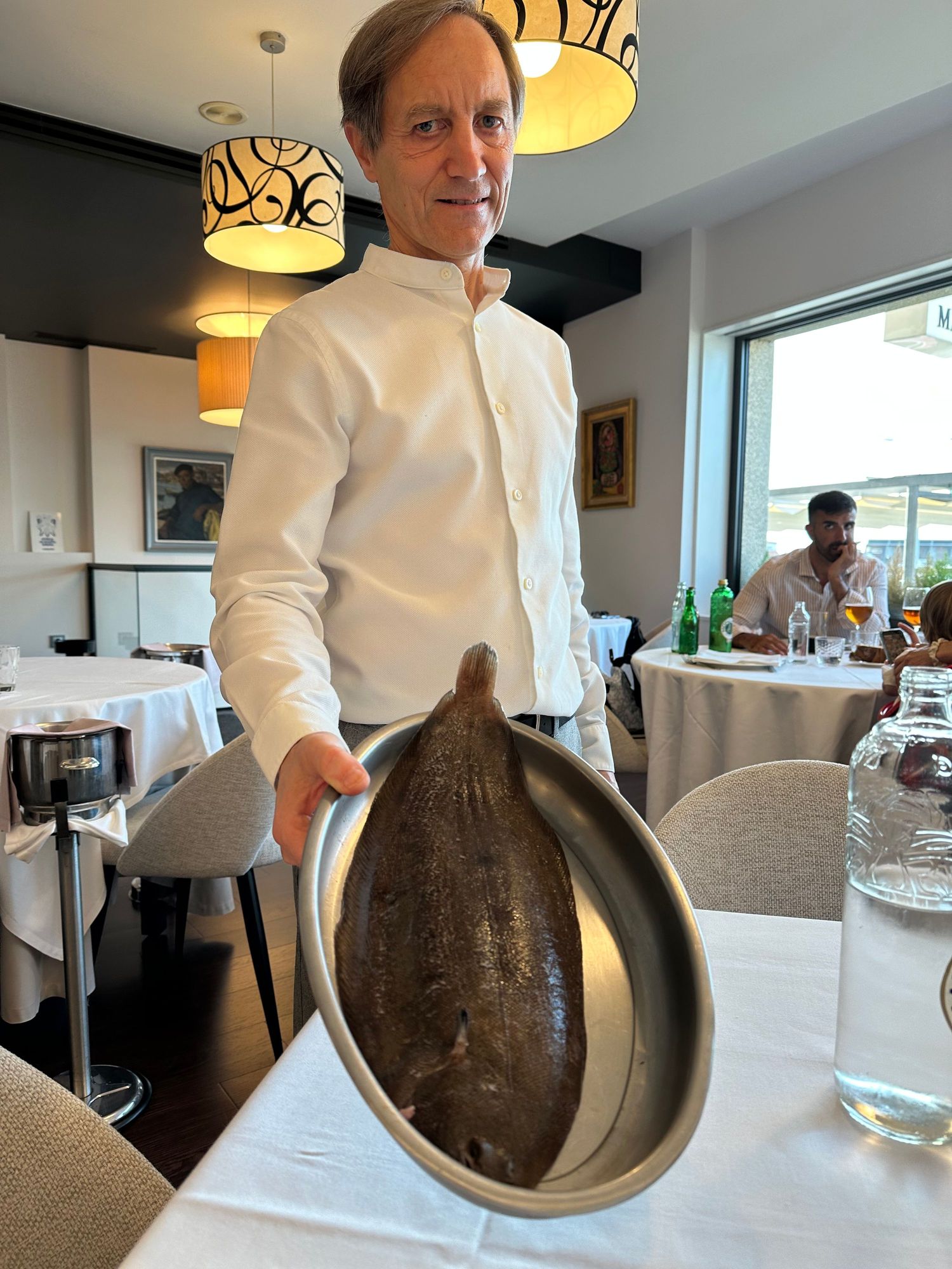 Our courtly and welcoming waiter presenting the lenguado (Dover sole) that we chose to share