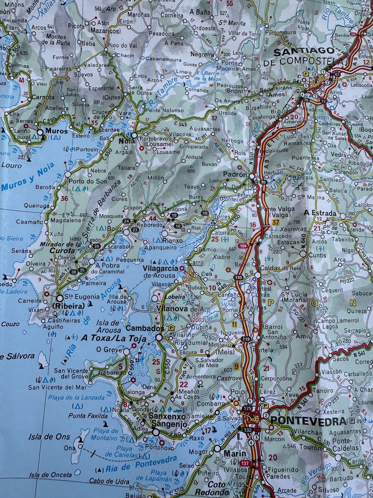 Portion of the Rias Baixas area of Galicia. The "Rias" are the inlets that pierce the coast from the Atlantic Ocean and give Galicia an extraordinarily long length of coastline.