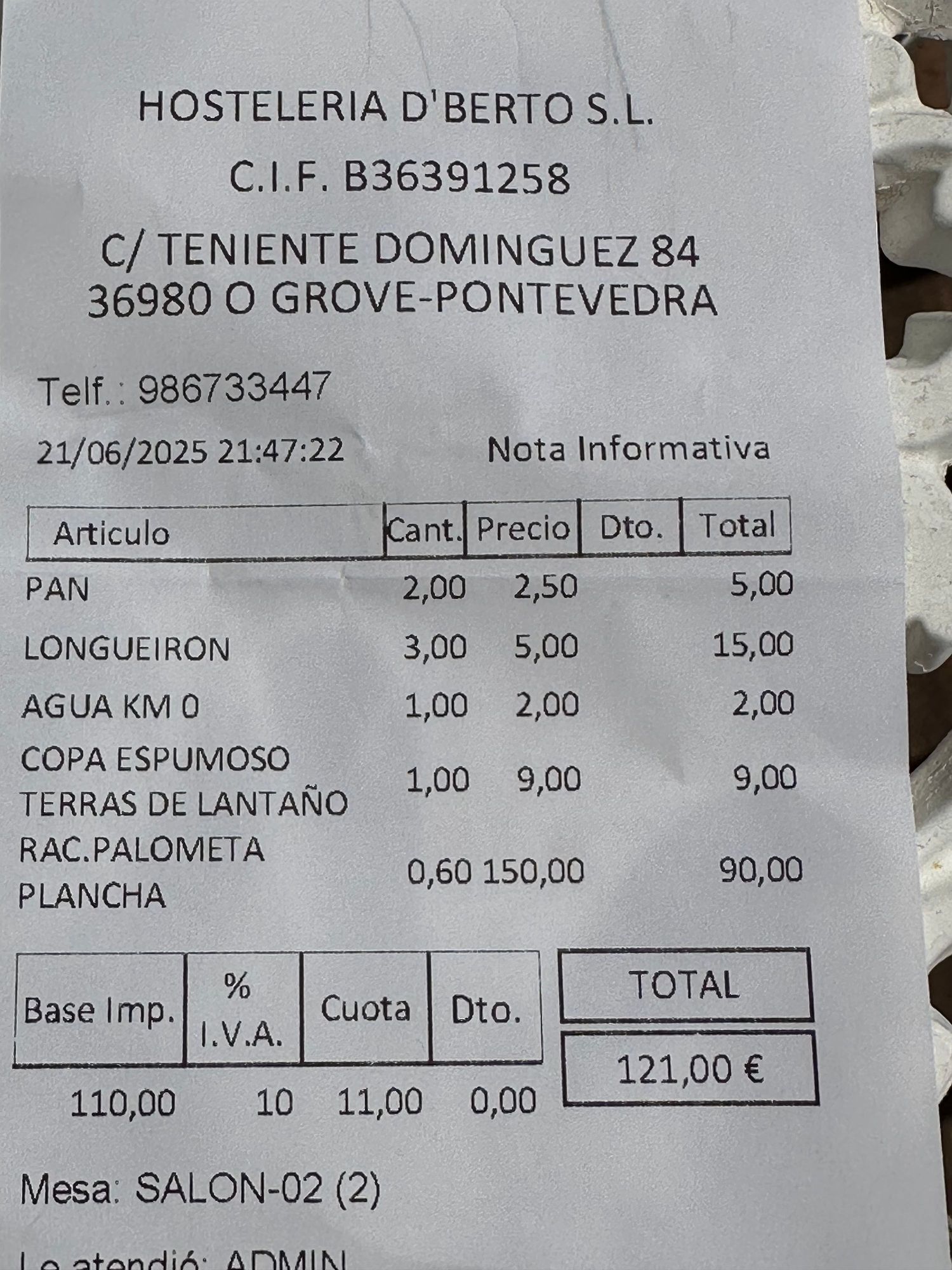Dinner bill.....121 euro with bread, wine and water. Truly a bargain for this quality of product.