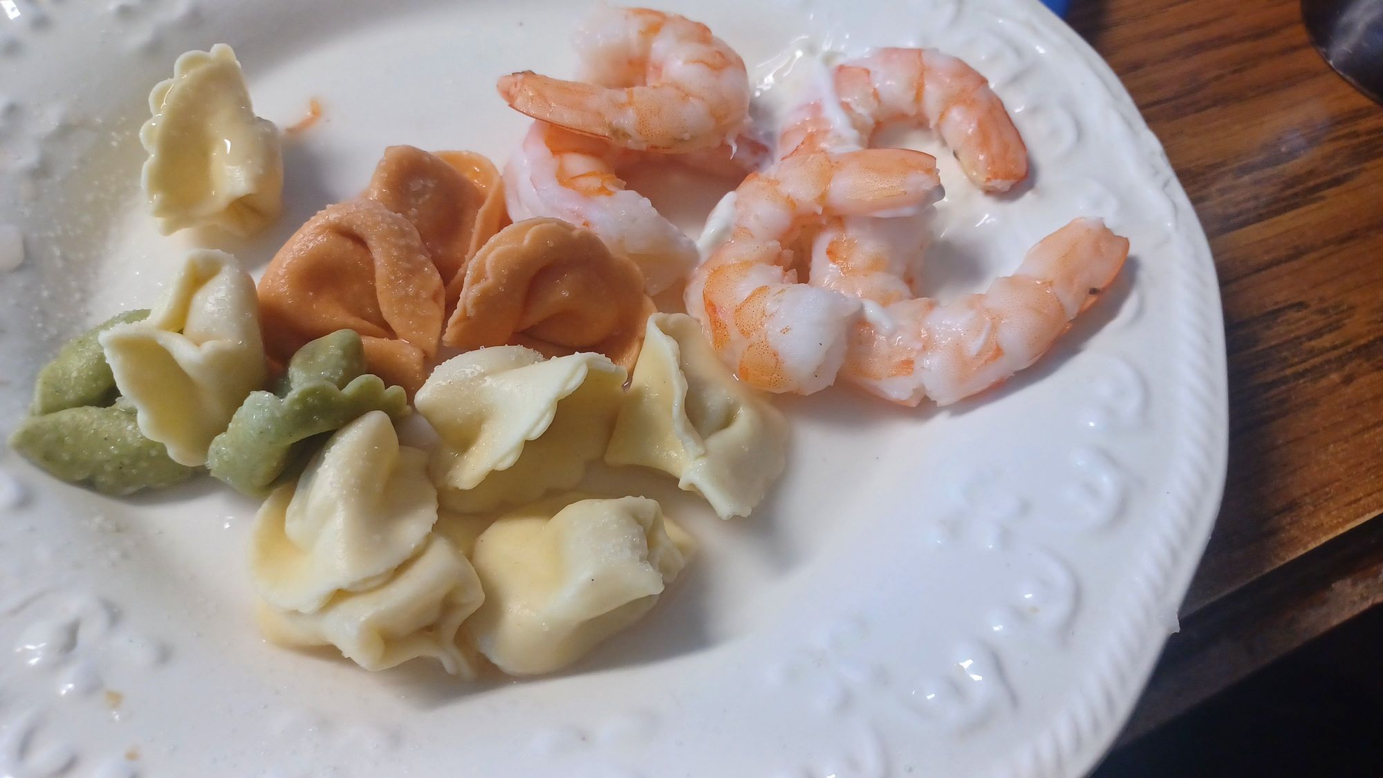 Cheese totellini and boiled shrimp. Not shown cukes and celery with romaine.