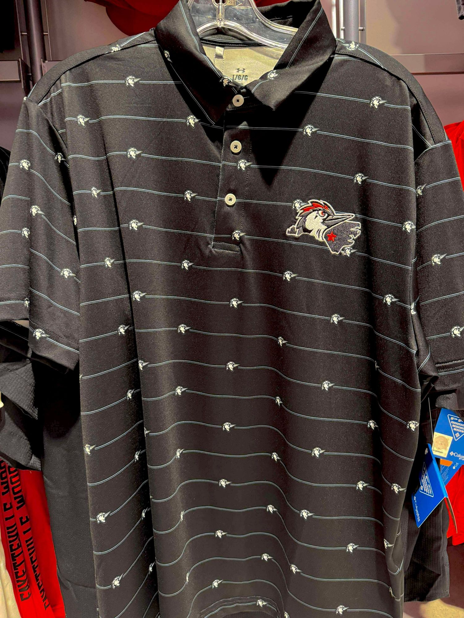 My souvenir for the trip, a polo shirt featuring the logo for the home team, the Fayetteville WOODPECKERS, which is repeated throughout the shirt!