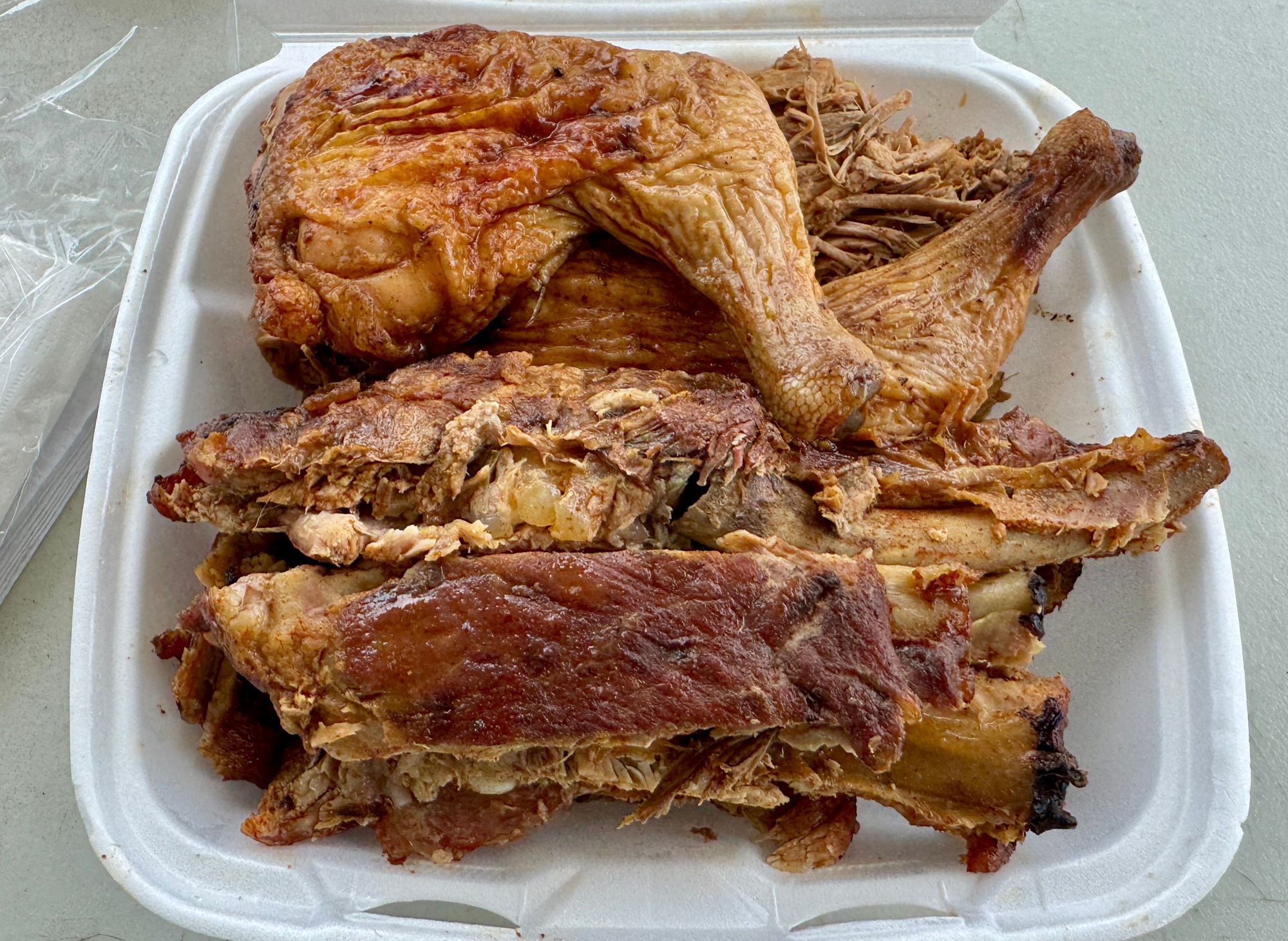 All this for 20 bucks, which was more than enough to feed the four of us. The pound of delicious pulled pork is hidden under one of the chicken quarters as are the other six ribs.