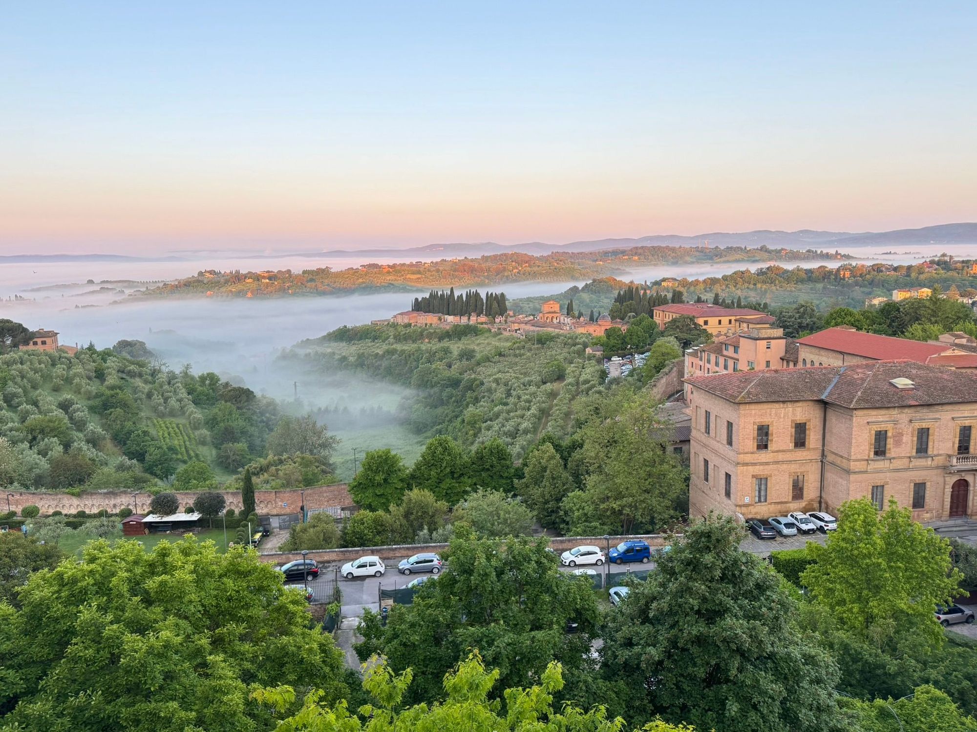 View from our hotel room in the early morning with the mist and fog rolling in.