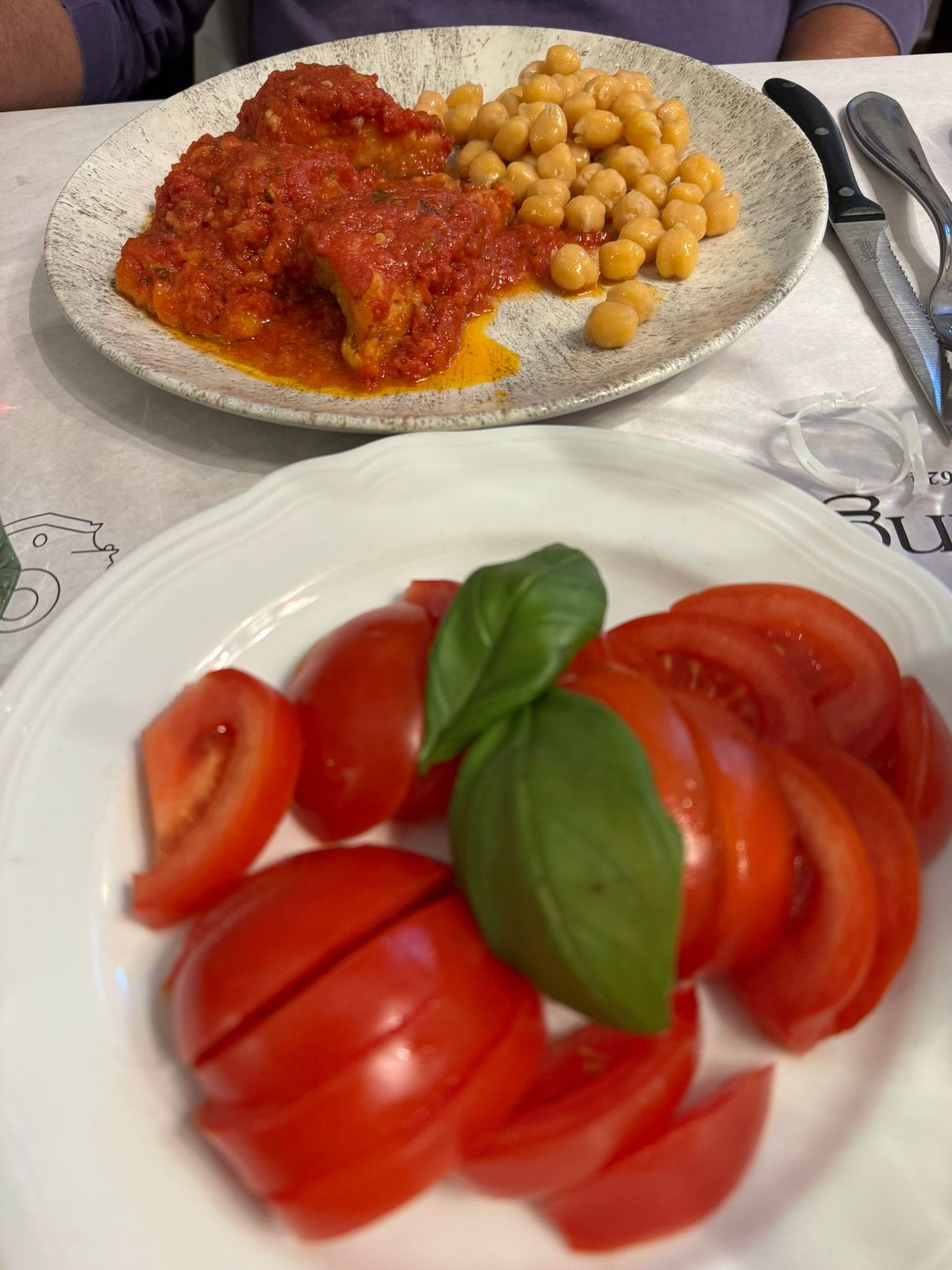 Platter of fresh tomatoes and Ed's cod with tomato sauce and chick peas