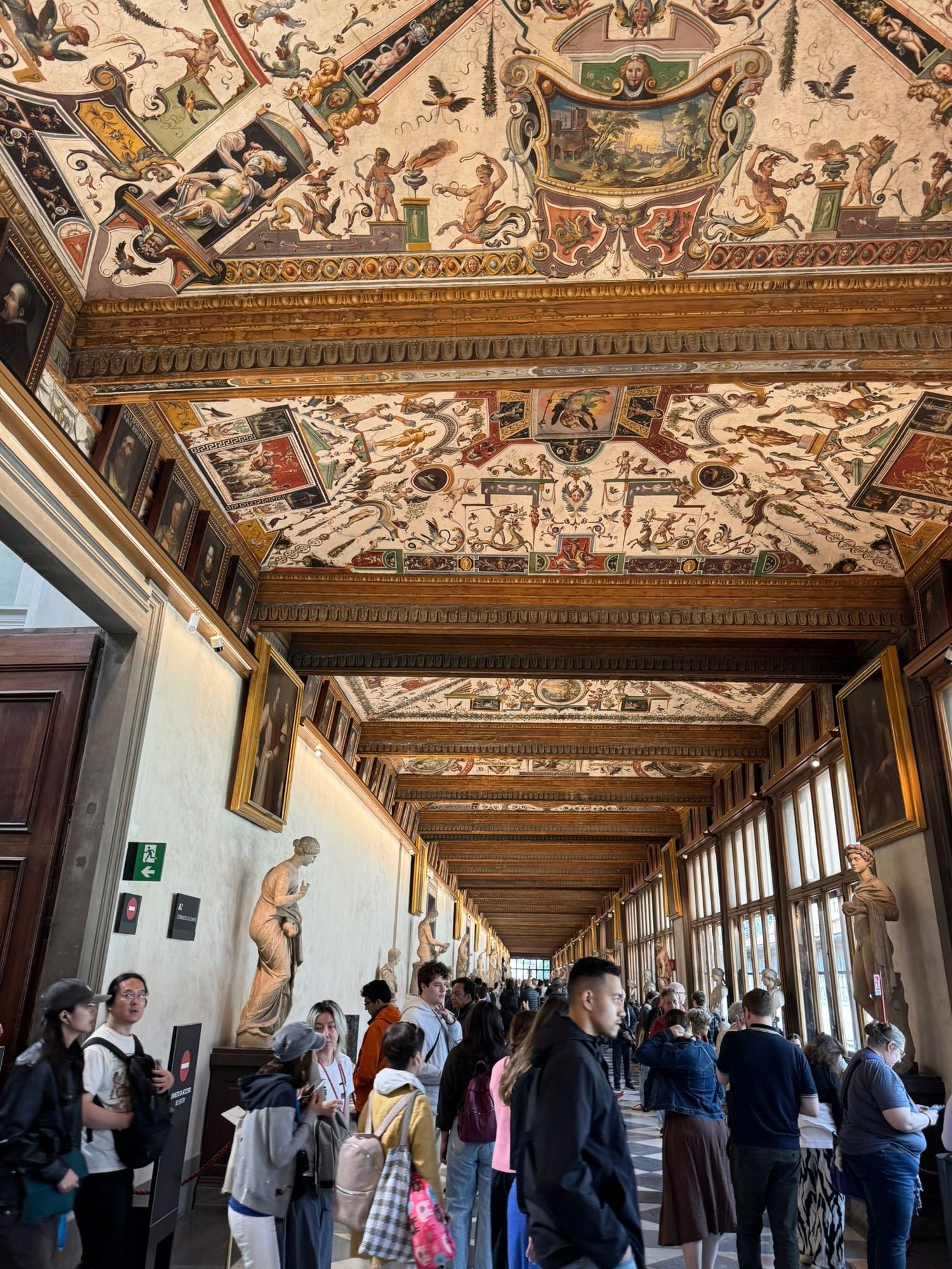 The elegant corridor of the Uffizi Gallery. the Uffizi contains the world's richest collection of Renaissance paintings and sculptures, including masterpieces by Botticelli, Raphael, Michelangelo, and Caravaggio.