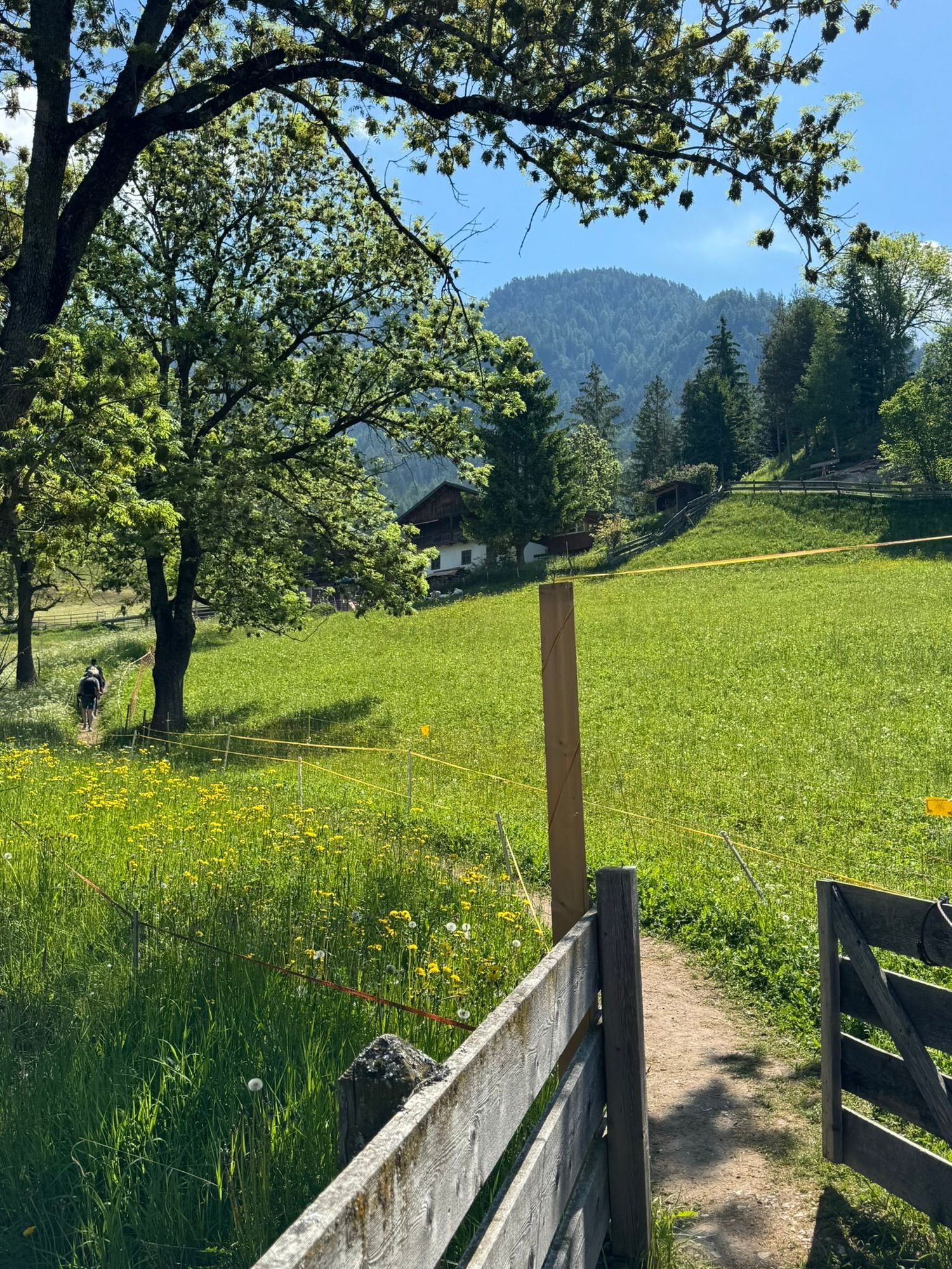 The Santa Maddalena Trail - part of the trail is a narrow path through a farm