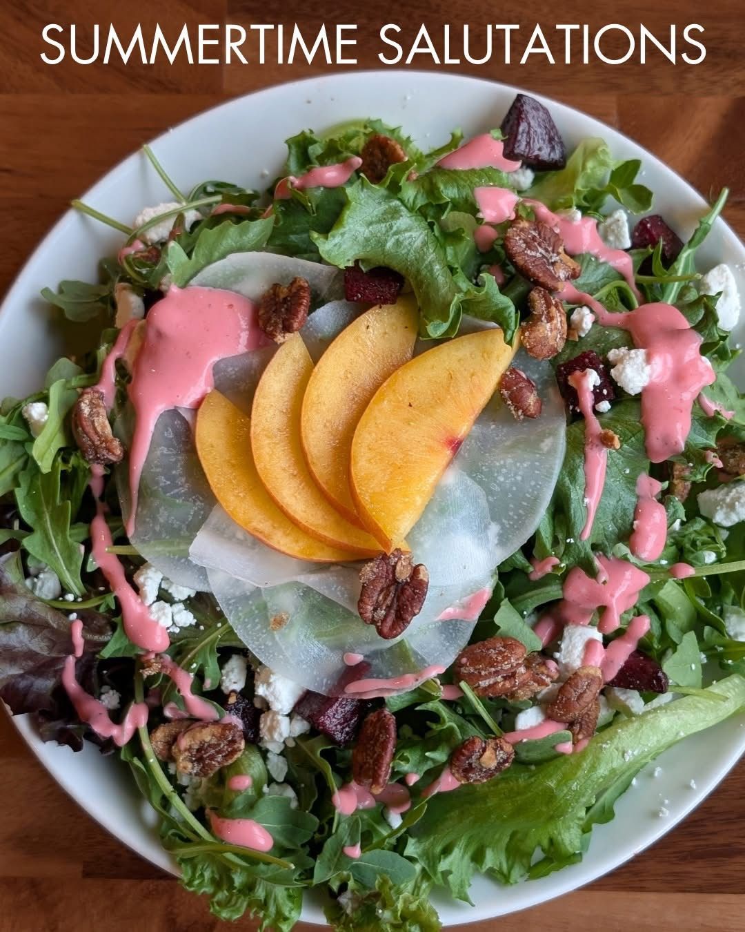 Wednesday restaurant salad. Odd white layer under nectarines is finely shaved lauer of harukai turnip. Pretty tasteless. Small diced beets were good.