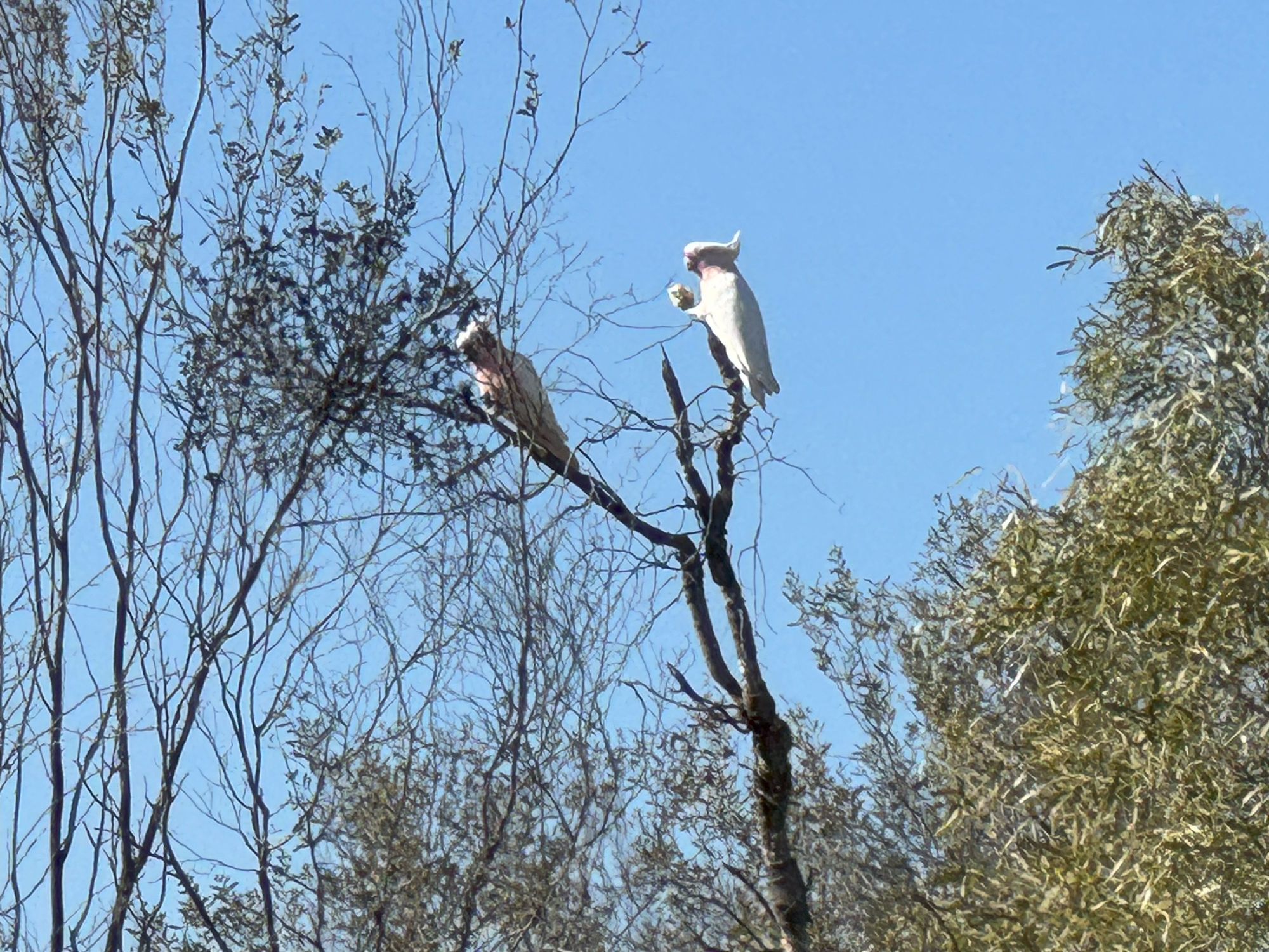 Pink cockatoos (aka Major Mitchell cockatoos). Wished I brought 1) my binoculars and 2) my SLR camera with zoom lens!