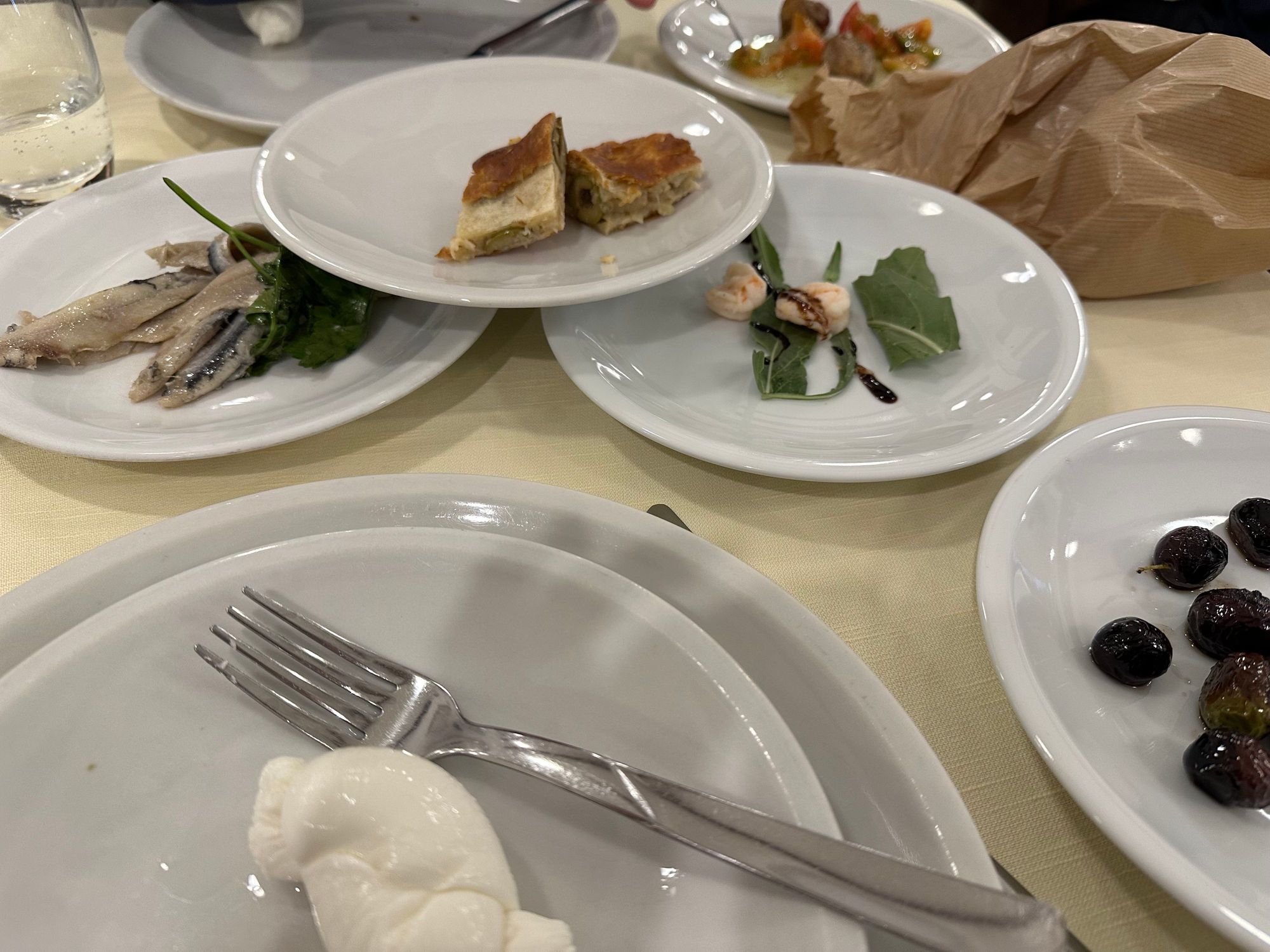 Mixed antipasti including marvelous onion calzone; mozzarella; anchovies; olives; meatballs....