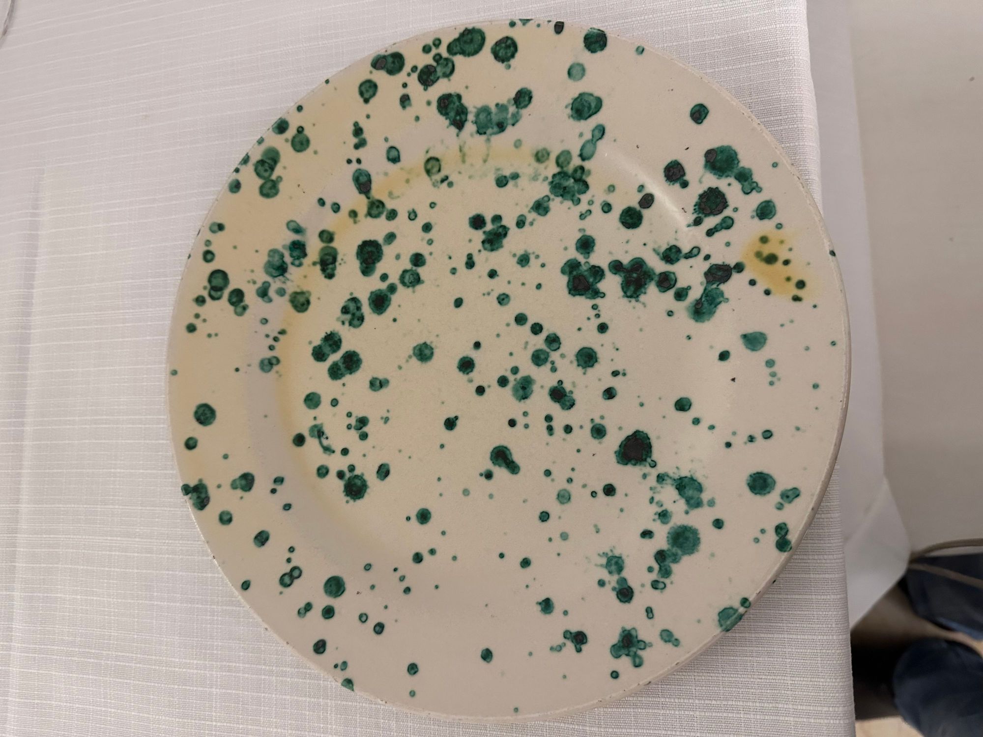 Dinner plates are splatterware from Grottaglie; that's not a stain.