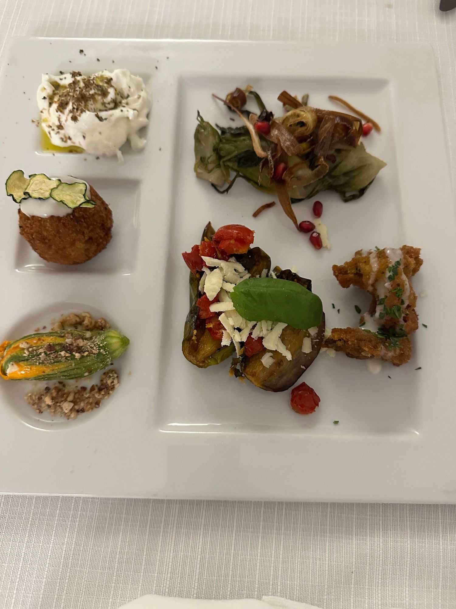 The mixed appetizer plate had zucchini blossoms stuffed with ricotta, vegetarian meatball, stratciatella cheese (one of my favorite fresh cheeses; hard to find in the US); stuffed eggplant, fried Cardoncelli mushroom.