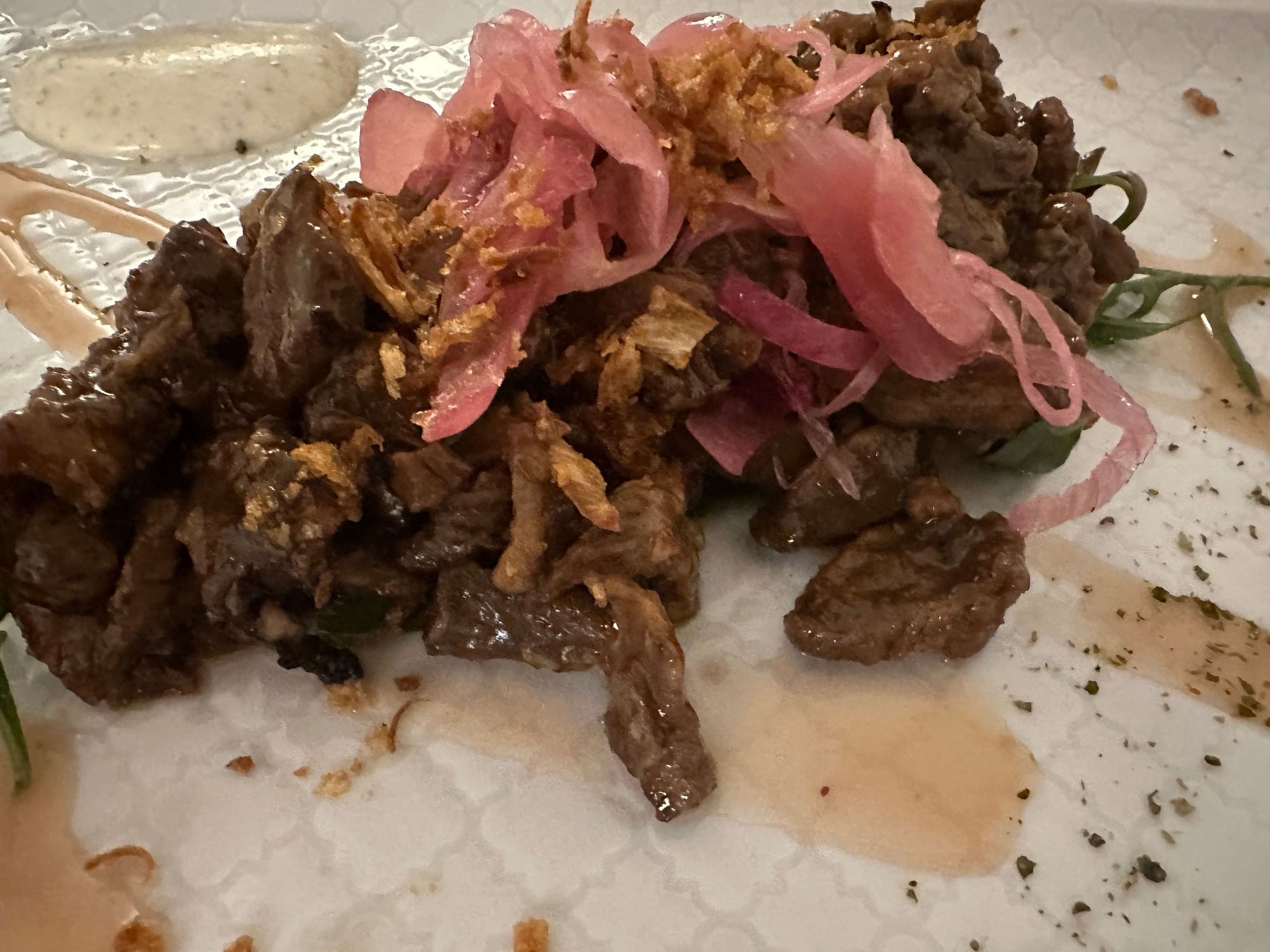 These are strips of pork with caramelized red onion glazed with a Negroamaro sauce--it was fantastic but we could not finish the entire dish. (might order this again tomorrow!!)