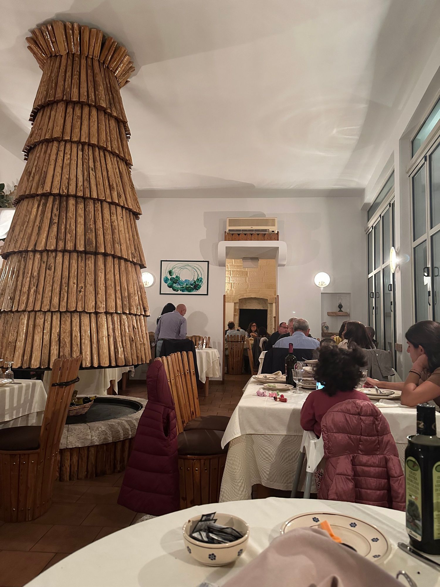 Detail of the large, high-ceilinged interior with the odd sculptures (made from barrels staves??)