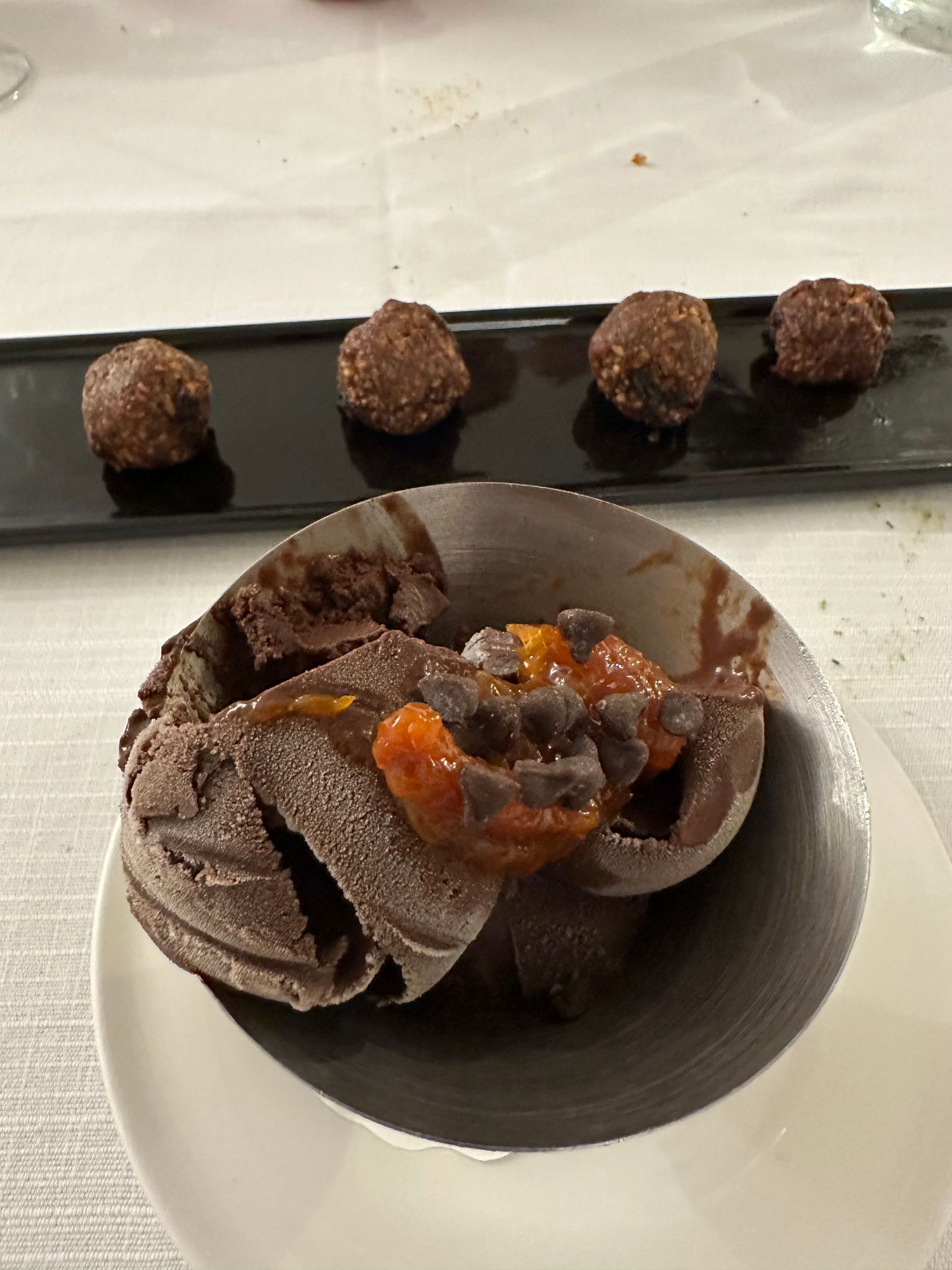 Chocolate gelato with bits of fruit rind and, in back, biscotto Cogliesse, made from ground almonds, sour am arena jam, and cinammon (not very sweet)