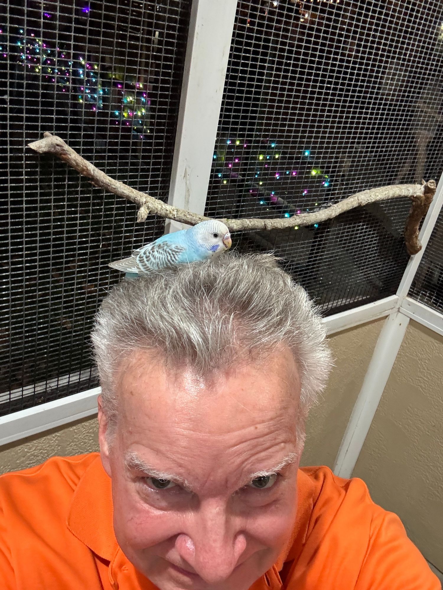 There's a parakeet cage where you could feed them, when they aren't landing on your head, lol!