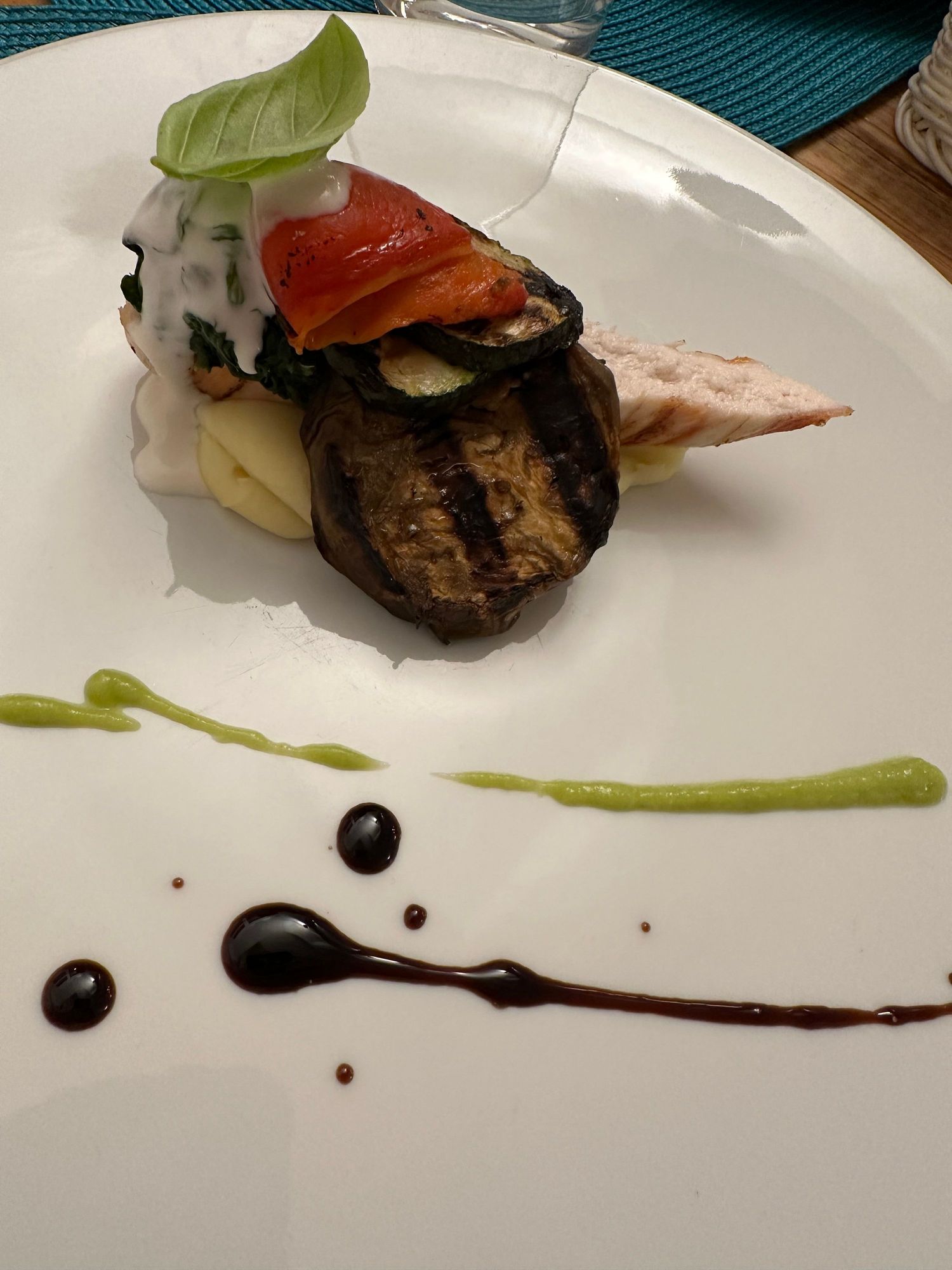 Roast chicken breast with eggplant, zucchini and red pepper served over creamed potatoes; it's usually no problem to ask for a half portion of a dish. Here, we asked for a full portion to be split into two and this was my half. The chicken was so juicy!!