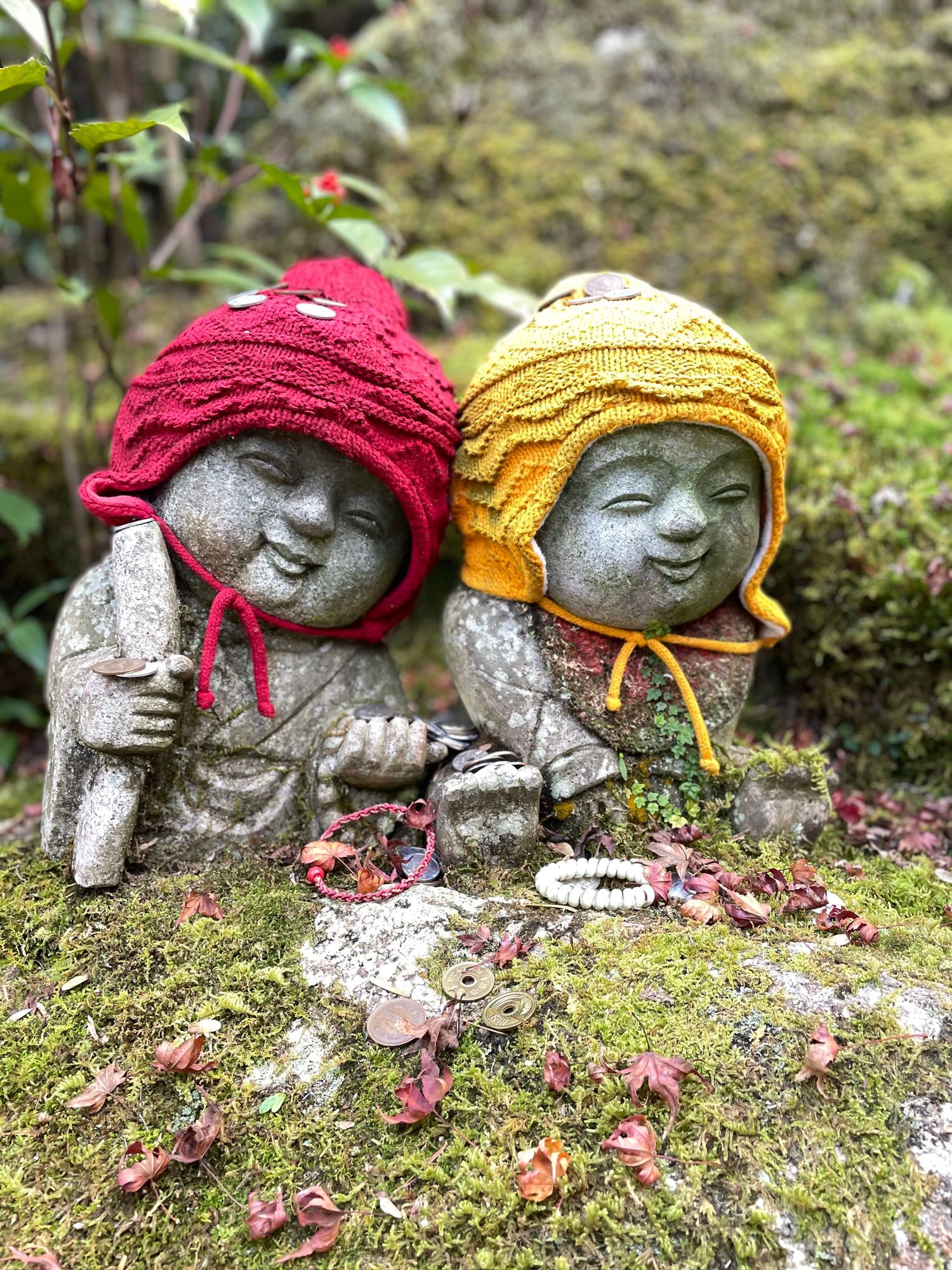 Small jizo statues are spread out all over the temple grounds. Hats are given as a way to shelter jizo from the elements and to show honour for their protection of children