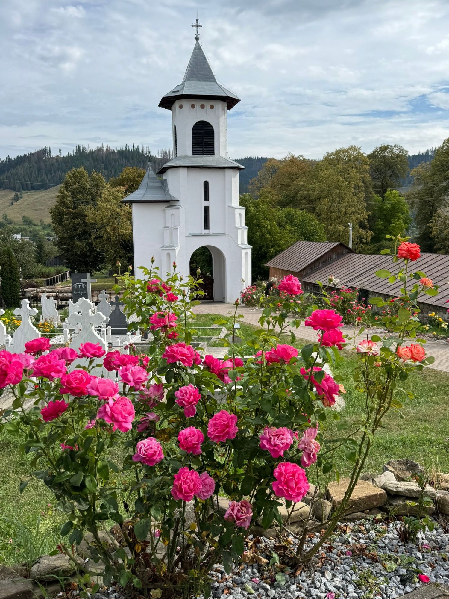 View from the church. Lots of pink roses!