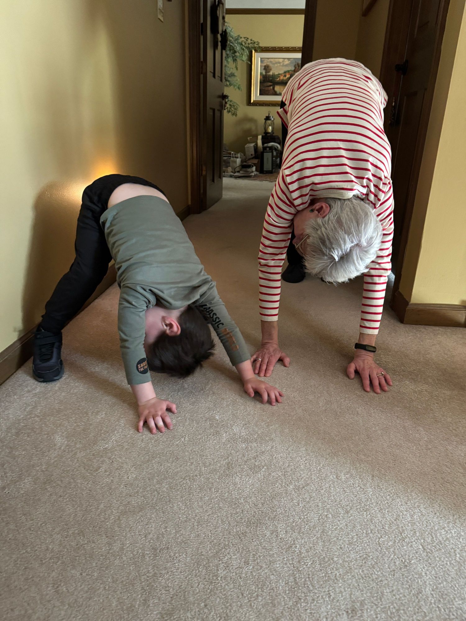 After doing the elliptical for a couple of hours, Joyce had him doing some yoga with a downward dog!