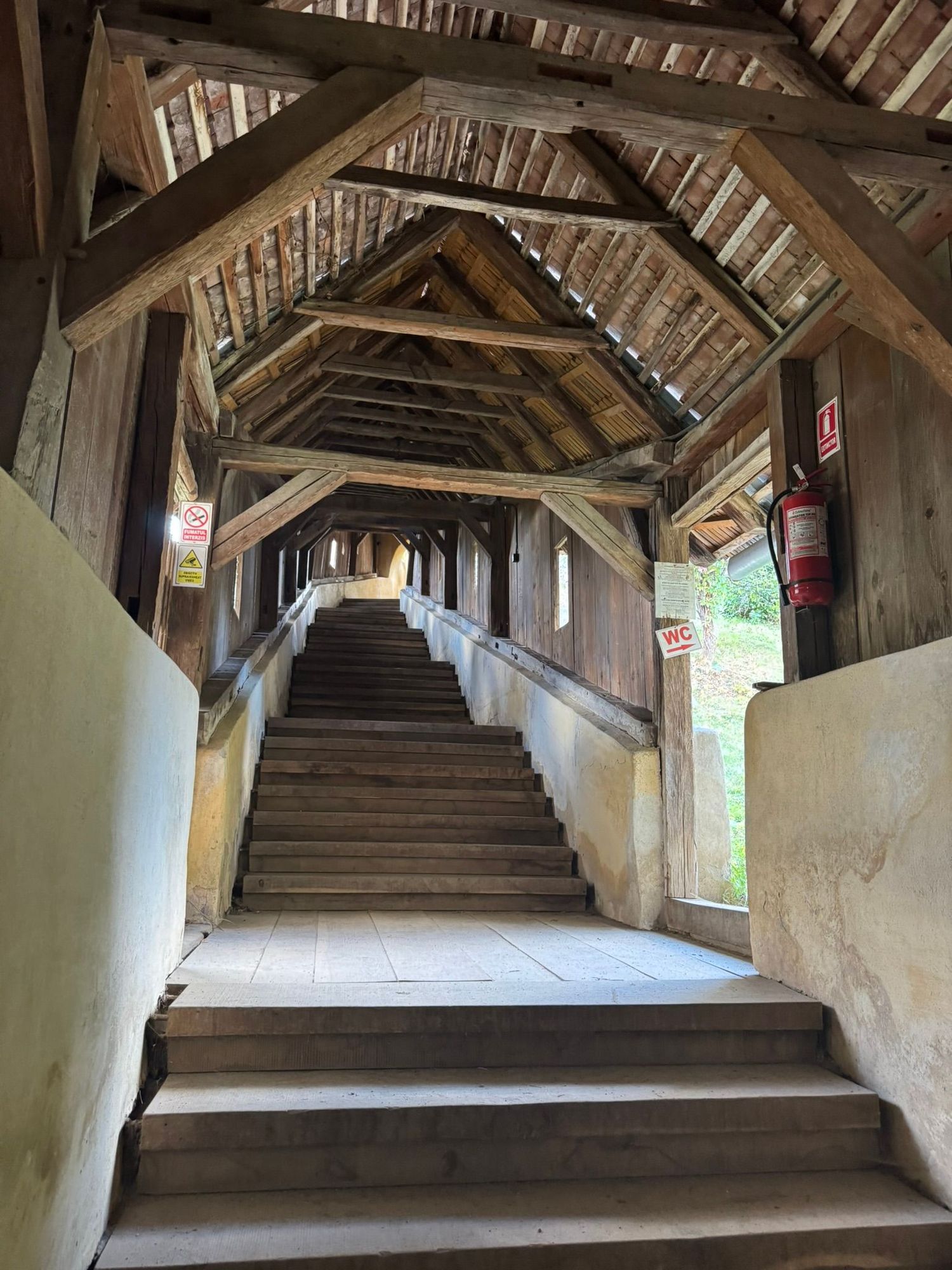 The splendid covered staircase that leads to the entrance of the fortified church in Biertan