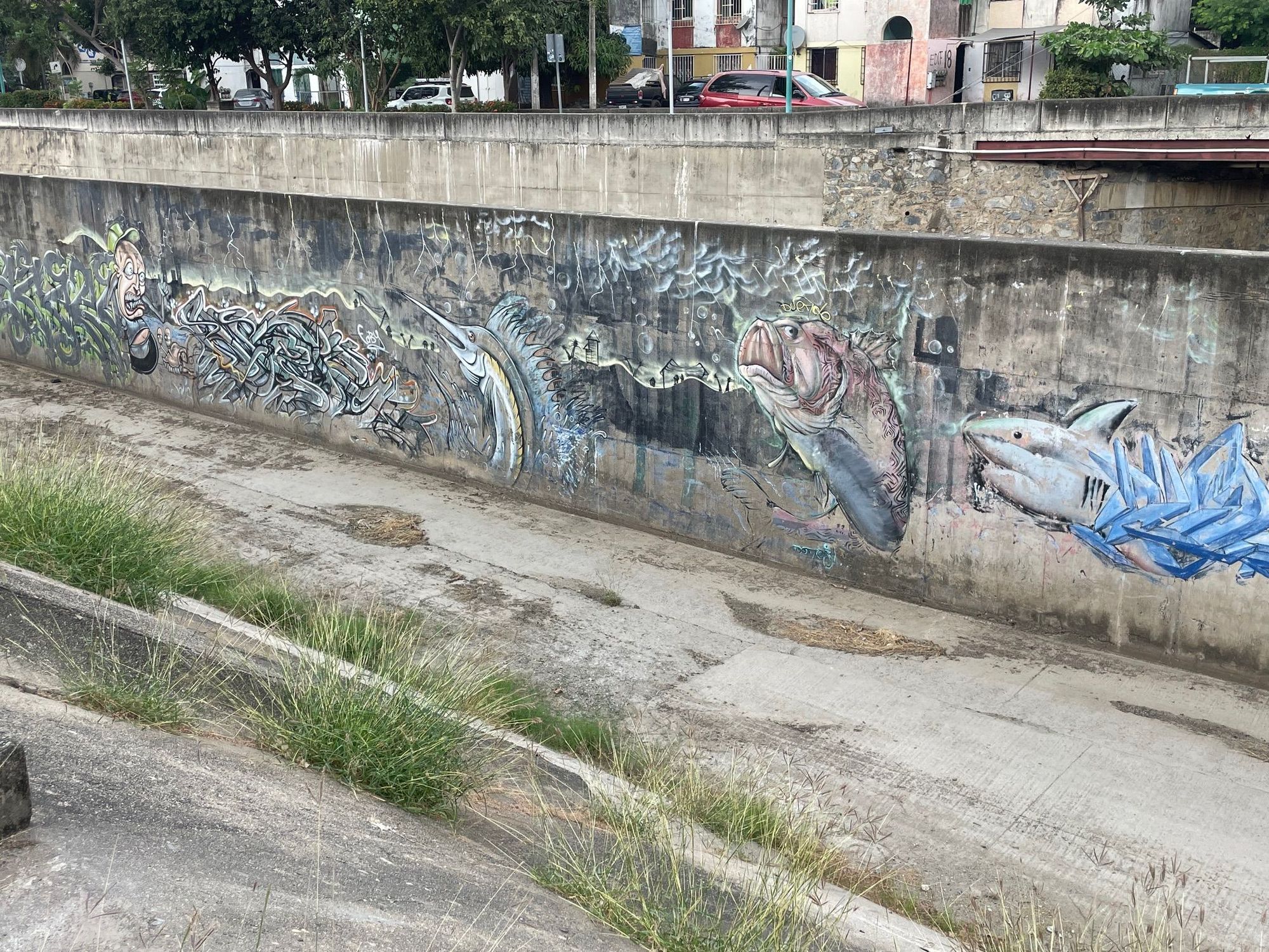 Up river along the canal. The canal is usually pretty empty except during the rainy season, so some artists has headed to divided wall in the canal to express his or her's inner Diego