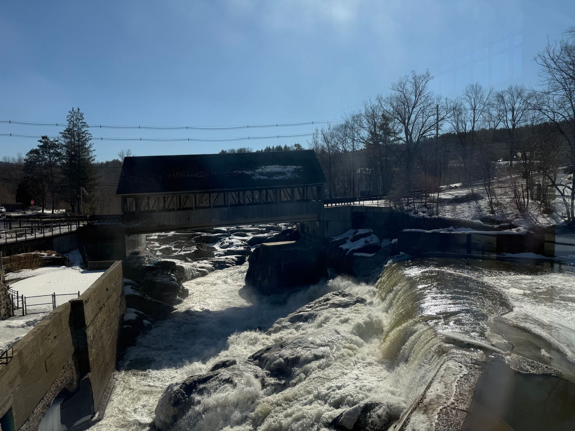 View from Simon Pearce restaurant in VT. the sun was facing us so it’s hard to see those falls and the covered bridge.