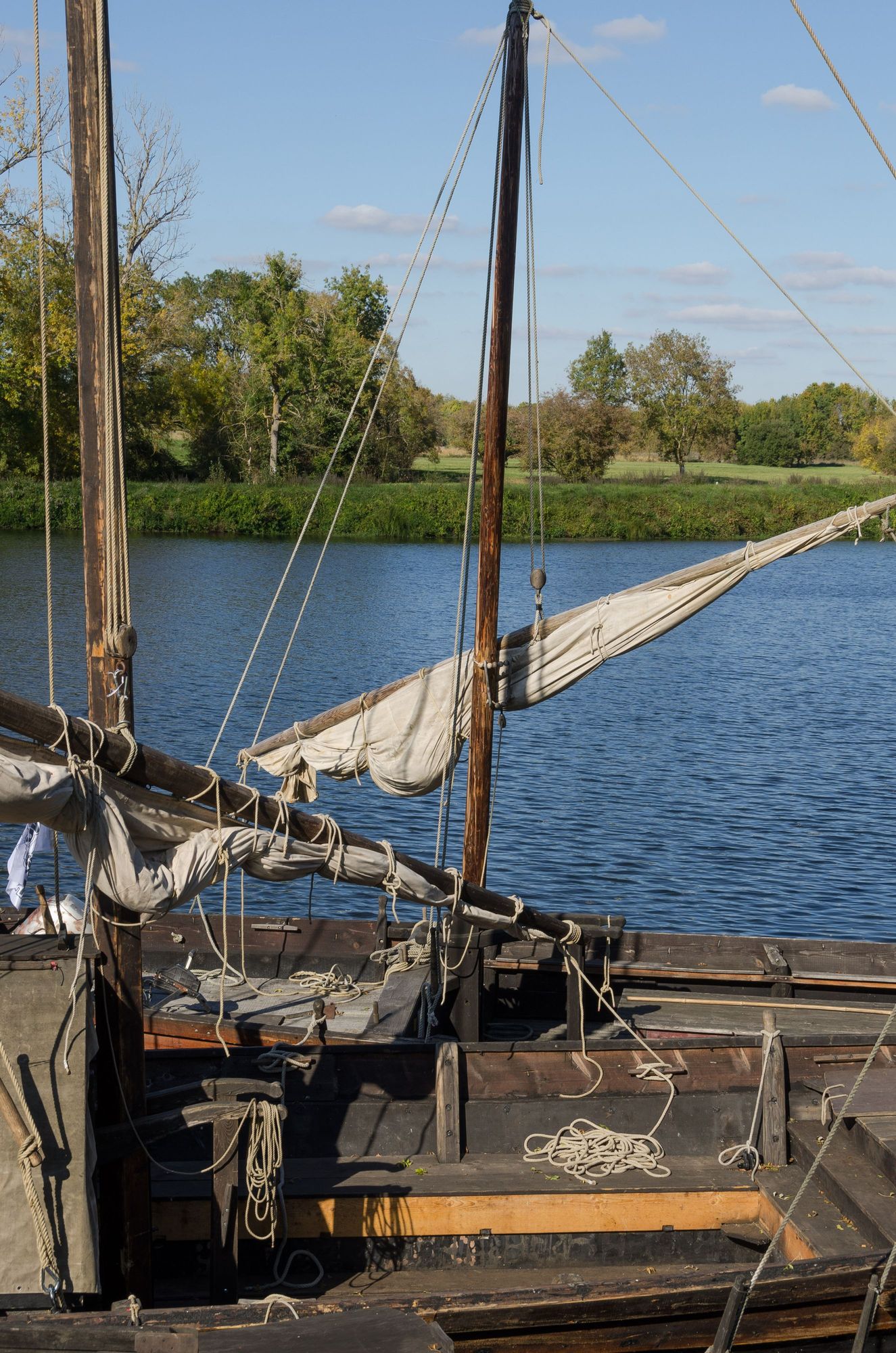 'The Batelier Barrage Port' was an area hard to miss. A family of local tourists came by. The father rode one of those low-rider recumbent bicycles. Over by the village's barrage-dam, Mrs Z had a chat with a father and his adult son. Directly beside those rivermen was a trio of ghostly white hounds-from-hell sculptures posed to be approaching a historic watermark. Seen here is one gabarre that reminded us of the cover to a children's book we'd just seen back at our Tours rental (see below)