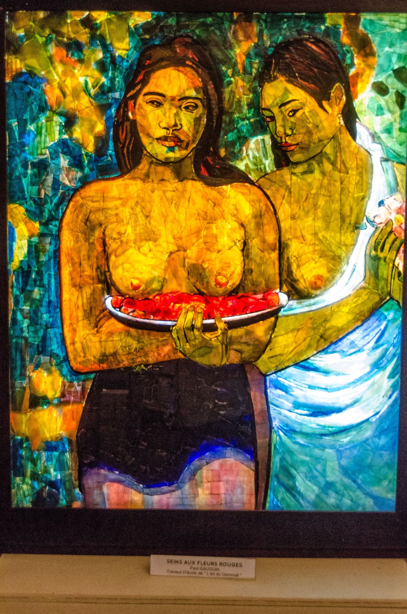 Unexpected added-value is found in Montresor and who knew? On rue Marche in the former Carders Hall (1750 wool market), one may visit the free 'Gemmail' exhibit. The art is a cousin stained-glass and is illuminated from behind. Both Cézanne and also Picasso once experimented in this rare and colorful art form. *Merci to JP Sala-Malherbe for donating this welcome bit of color underneath timber frames and mansard roof.