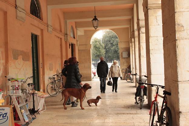 Under the riverside portico.