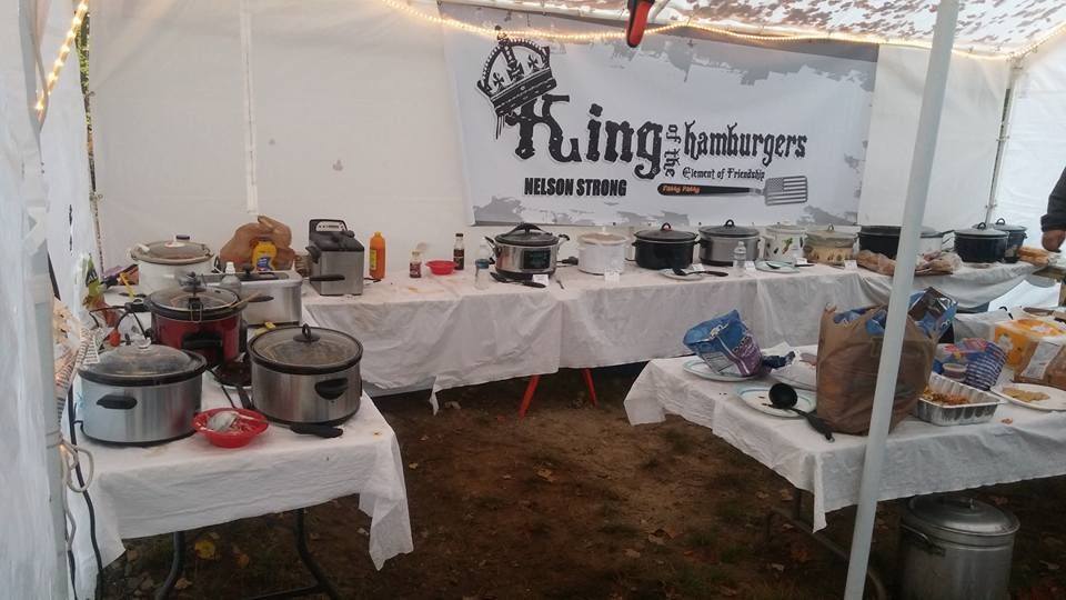 Here's my photo attempt. This is the cook tent the guys set up when they do their private camping weekend. They have to use generators to run the crockpots. In addition to the graphic banner, they design and order sweatshirts and tees each year. The graphic is derived from the famous King of the Hammers race logo. I think they got permission to modify it for their use.
