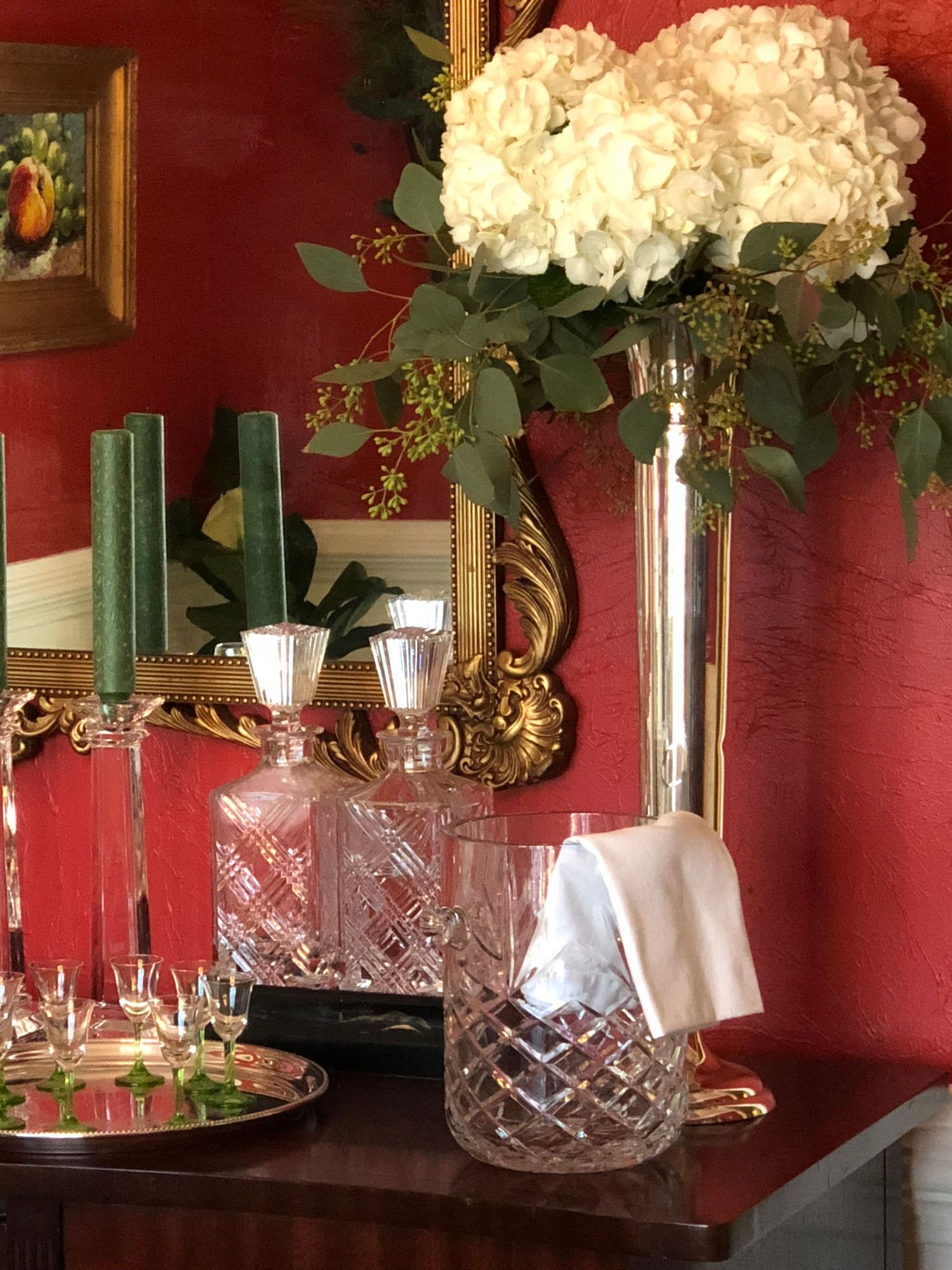 Trumpet vases on the sideboard with the loveliest hydrangeas!