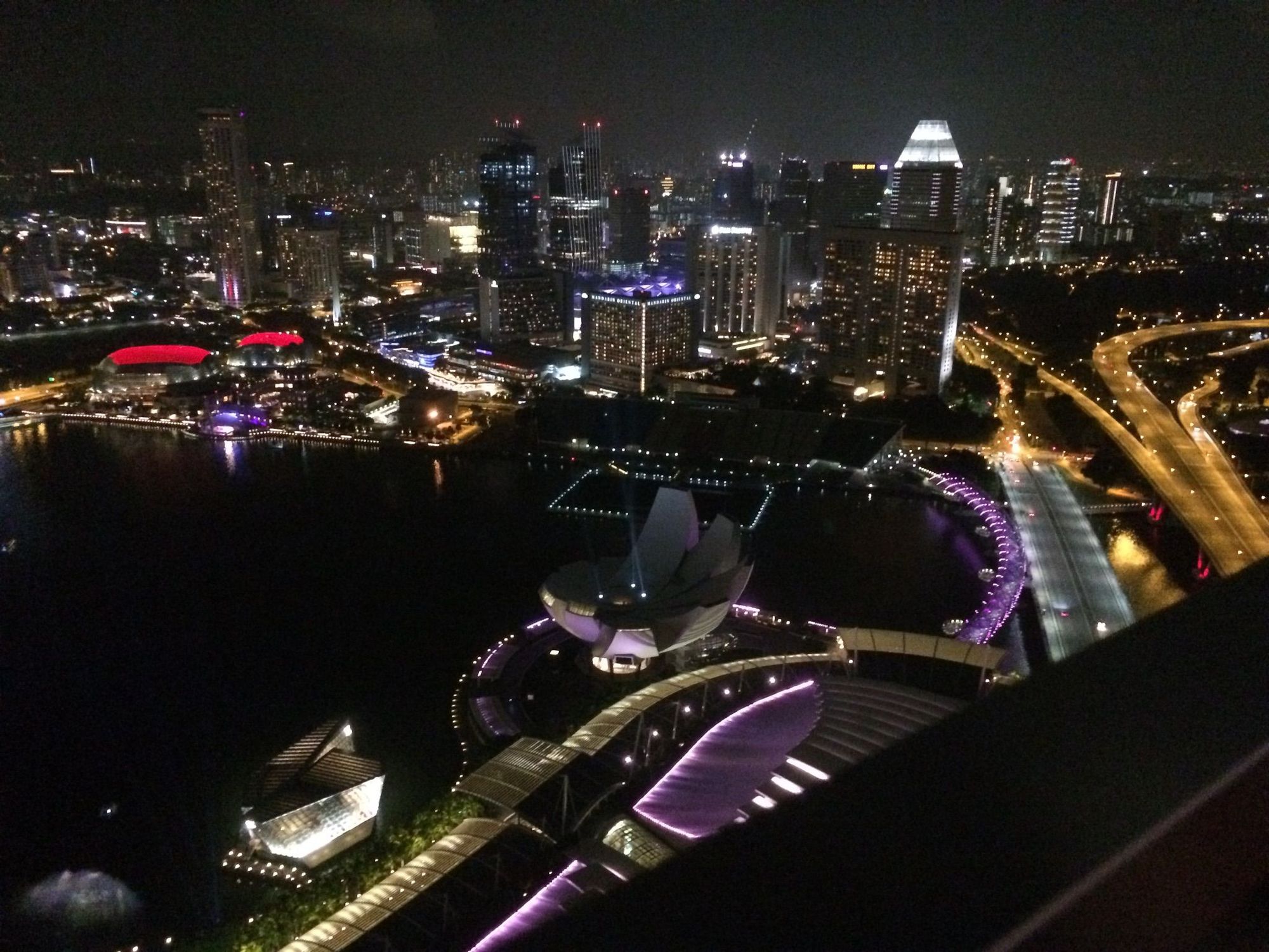 Singapore at night from a restaurant on top of the marina Sands Bay Building.