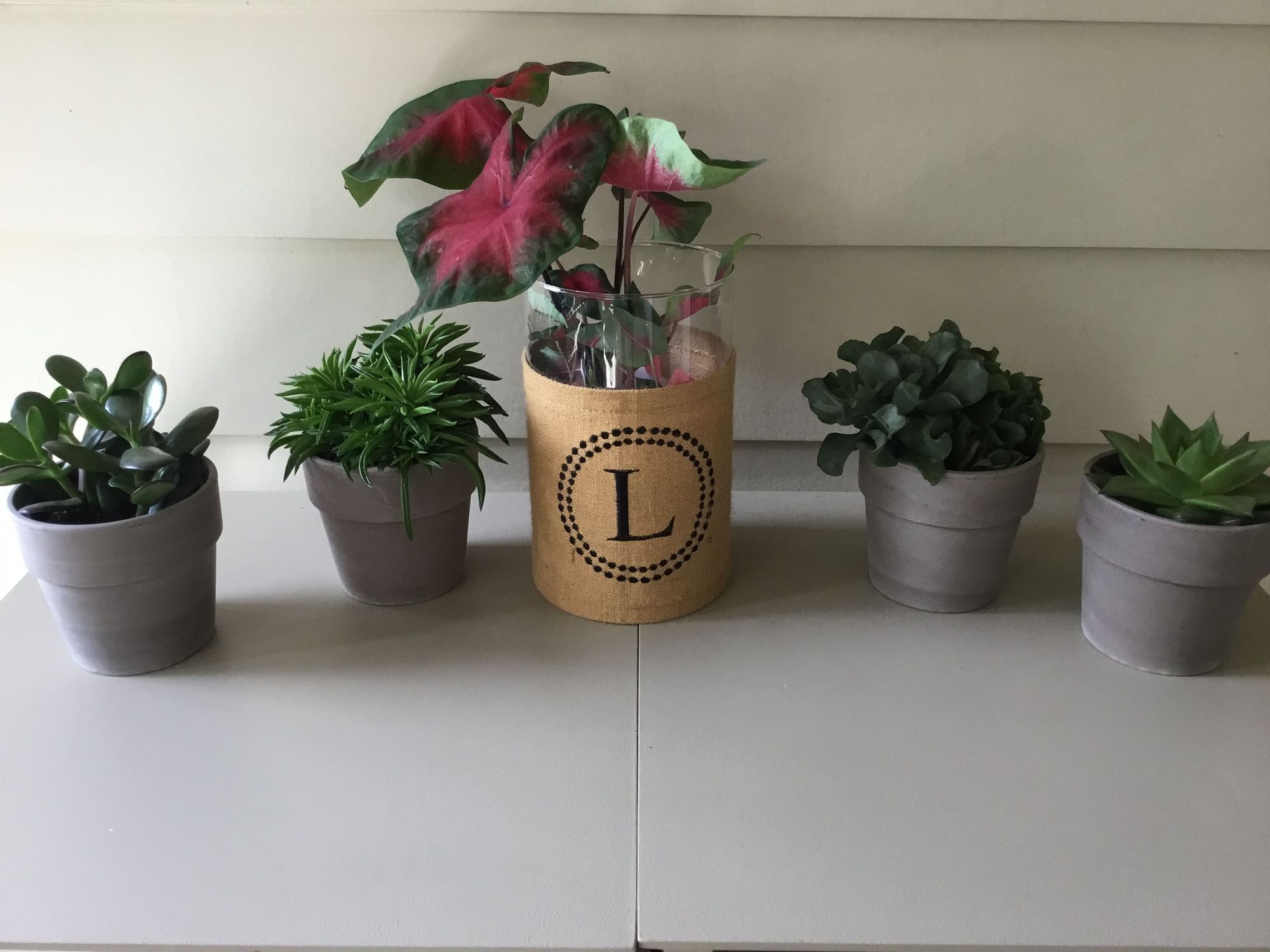 Succulents and a coleus on porch