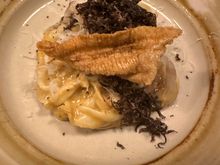 MONT BAR’s creative Catalan “mar i muntanya,” or sea and mountain combined in one dish. This is warm squid sandwiched between impossibly crackly chicken skin