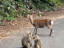 I love this photo that Miho took of us. It shows how close one can get without disturbing the macaques. The only time they reacted was when someone else who had stopped to photograph them walked right up to them. The few cars that came by drove right through without disturbing them!