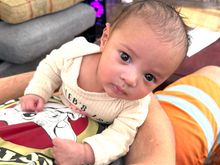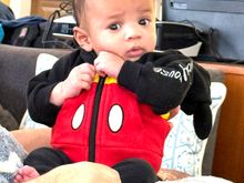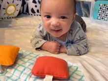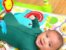 Kaleb has Leo to put his fingers in his mouth and tries to fit in a lot of them