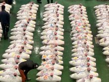 If you look closely you can see the auctioneer gesturing with his fingers as he auctions off the tuna.