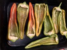 Delicious peppers which I ended up stuffing with brown basmati rice, onions, eggplant, garlic, ricotta, parmesan , toasted pine nuts and a little pesto. First use of new oven since it has finally cooled off today. These were the last of the peppers from our farmer as he, in a much higher elevation from us., has ha