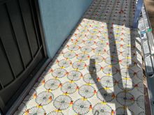 Tiles in process. The red and yellow dots are spacers. You can see a bit of house color and a tiny bit of trim.