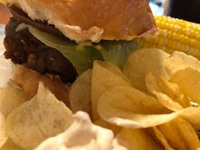 Hamburger on a water roll bun, cole slaw, corn from a friend’s garden and chips with homemade dip.
