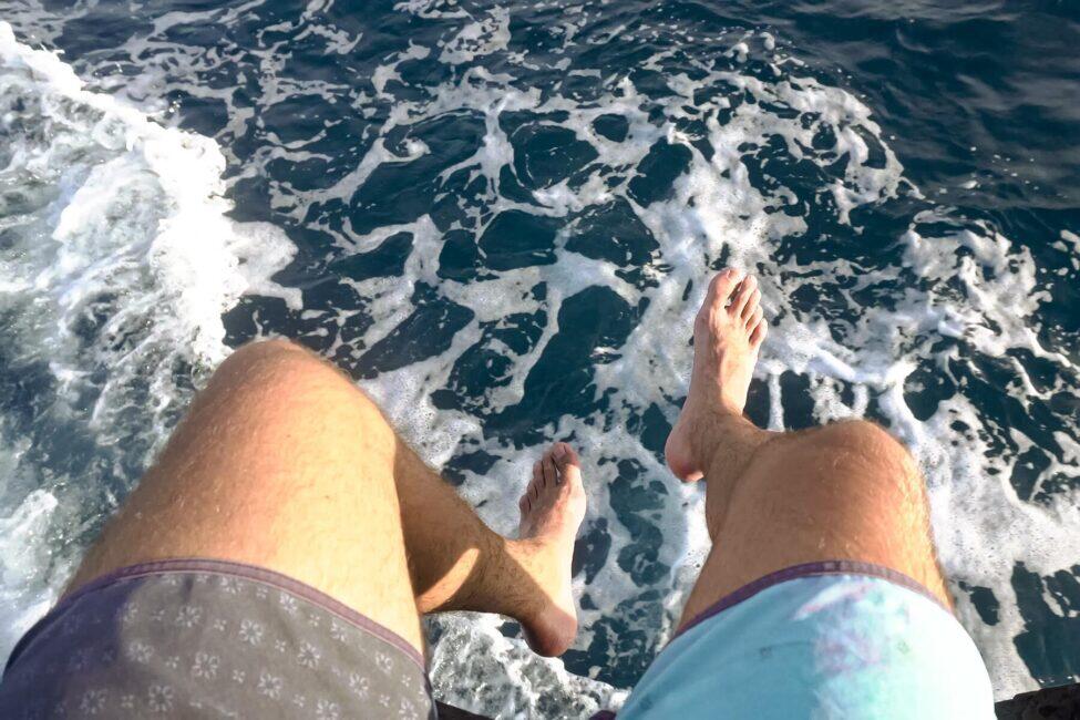 Third, Bucolo recommends keeping your clothing on. Clothing “can help create buoyancy to help you stay afloat longer without using as much energy,” he says. It can also provide “thermal protection in colder waters,” he explains. If you are wearing a long-sleeve shirt or pants when you fall overboard, Bucolo recommends taking those off and filling the arms or legs with air by swinging them over your head and tying off the ends. This will create more buoyancy and help you conserve energy, he explains.