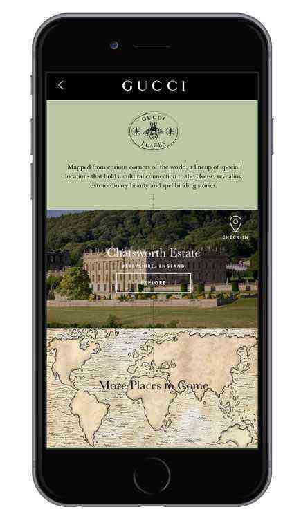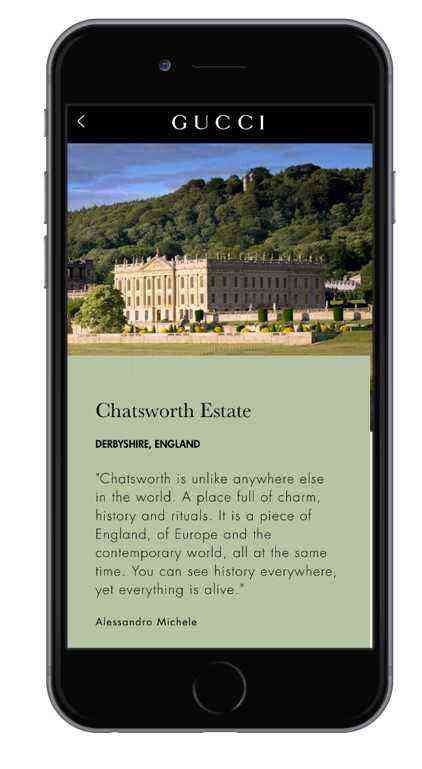 The first Gucci Place will be Chatsworth in Derbyshire, England, where Gucci is currently supporting an extensive exhibition of clothing and memorabilia entitled House Style, and served as the location of the Gucci Cruise advertising campaign.