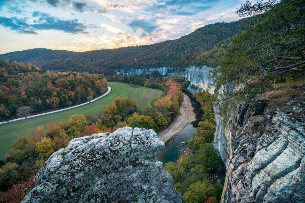 The hills of the Ozarks roll up from the beds of sparkling rivers and peak as the grand oak and hickory trees seem to sway on the ledge of limestone bluffs. The region winds its way through the southern portion of Missouri and into northern Arkansas and eastern Oklahoma, just barely touching the edge of southeastern Kansas. The air is as pure as the hearts of the people in the region, where mom-and-pop shops thrive alongside boutique hotels, chef-driven restaurants, and world-renowned art museums. A road trip through the region offers the chance to uncover the charming folklore, natural beauty, and undiscovered gems of the Ozark Mountains.