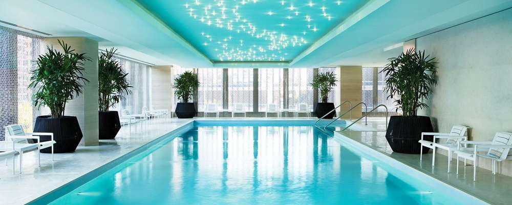 The hotel’s 67-foot pool is on the fourth floor and accompanied by a steam room and two saunas (one herbal and one Himalayan salt).