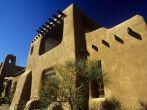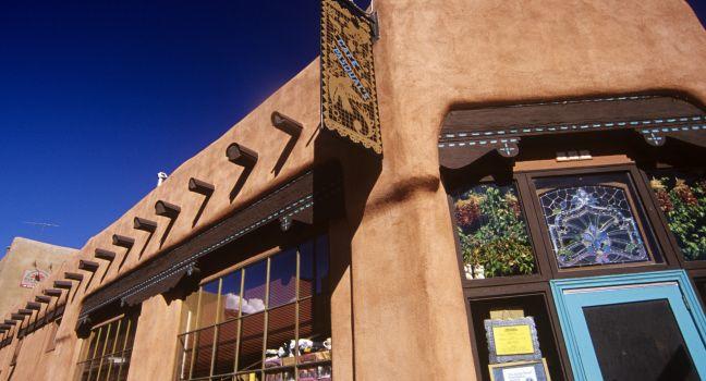 A traditional adobe building located on Museum Hill in Santa Fe, New Mexico. Front plaza area shows unusual paving detail. A traditional adobe building located on Museum Hill in Santa Fe, New Mexico. Front plaza area shows unusual paving detail.